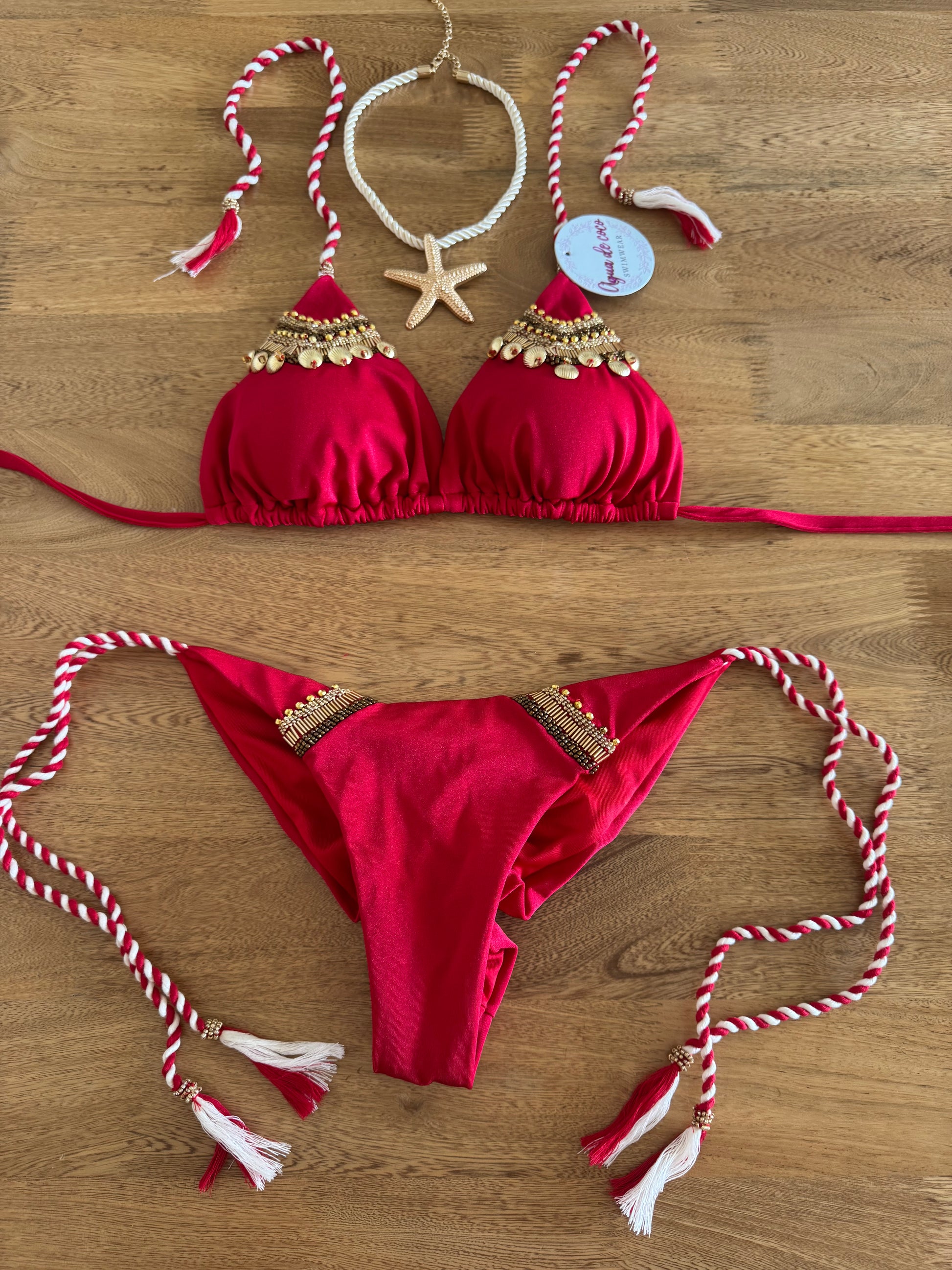 Hermoso Bikini prehormado con almohadillas; detalles bordados a mano. Lycra efecto satinado.