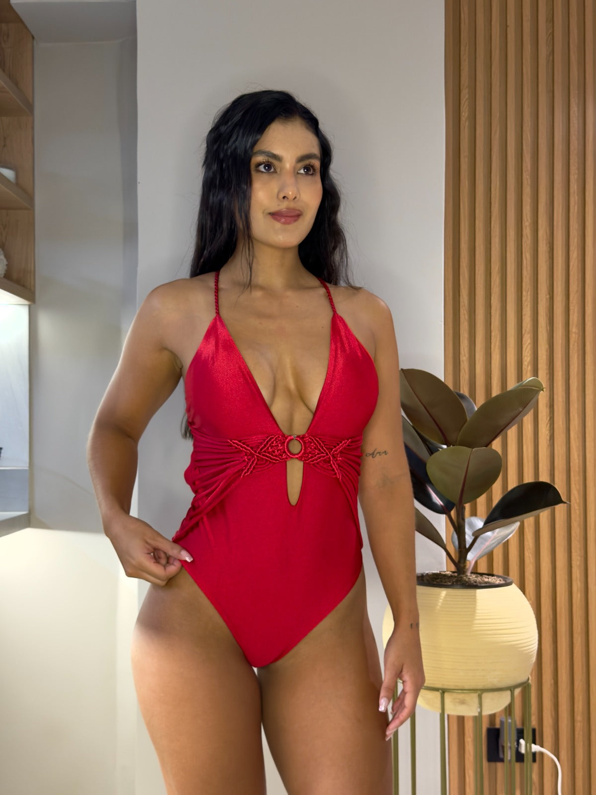 Este enterizo realza tu figura con un diseño elegante y moderno; con delicados detalles en macramé hechos a mano, que aportan un aire bohemio y artesanal.