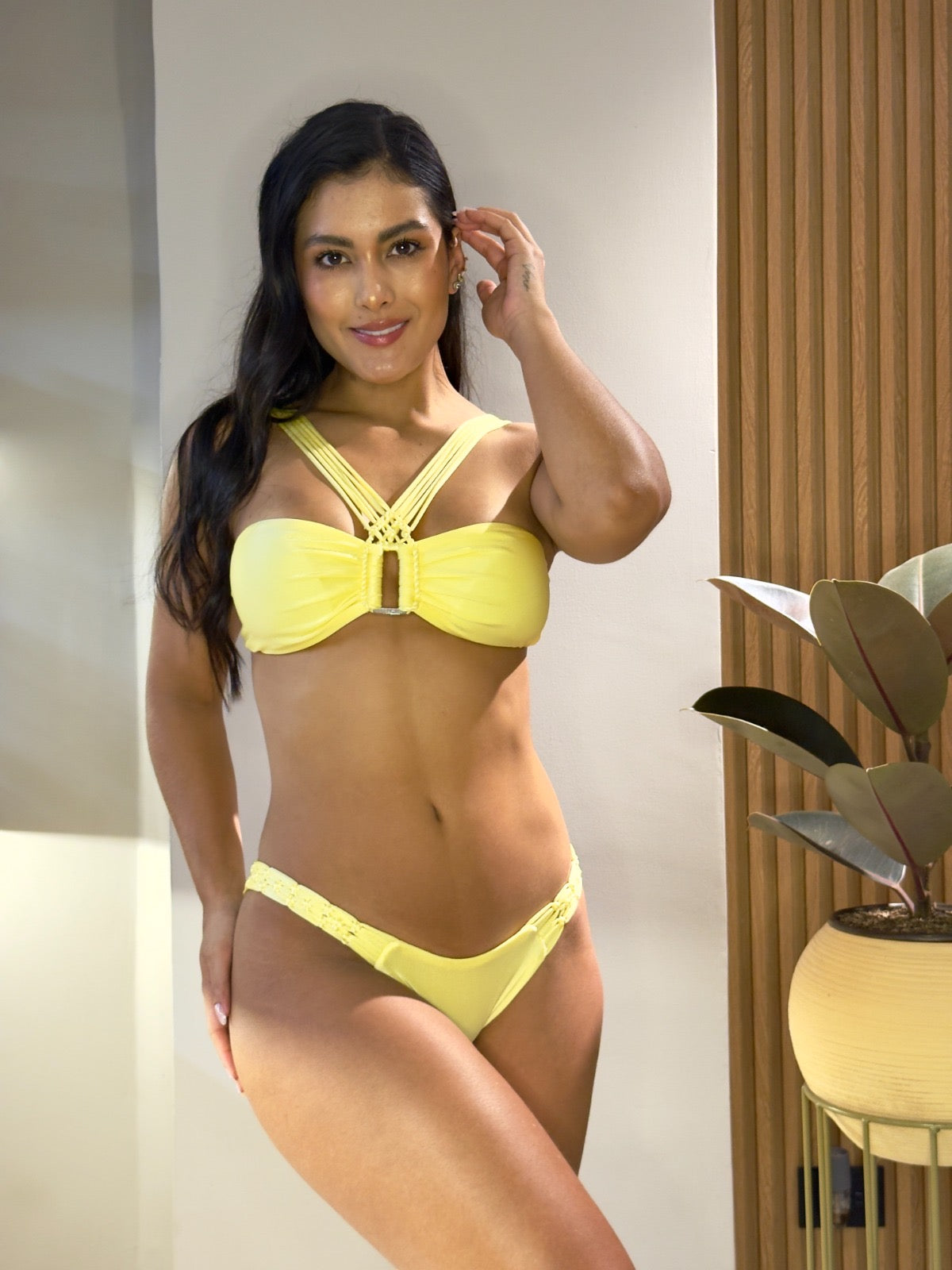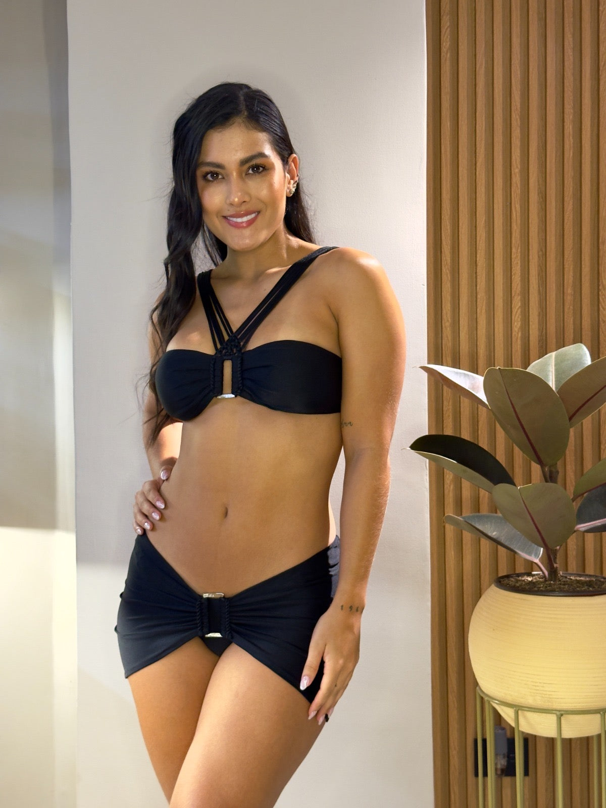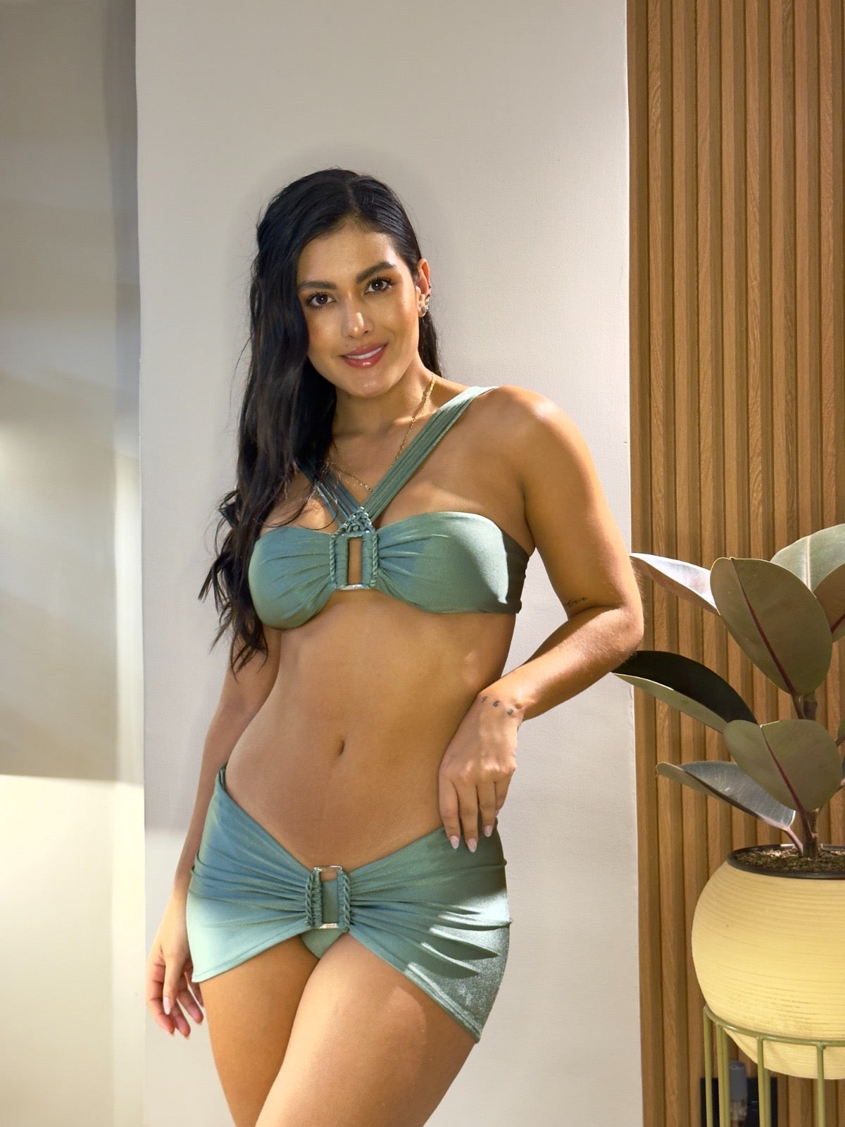 Set de Bikini y falda corta en lycra efecto satinado, ideal para lucir en la playa o la piscina. El bikini cuenta con Top prehormado con almohadillas y tirantes ajustables, Panty Clásico y falda corta que le da un toque moderno y sofisticado. El acabado brillante resalta con la luz, aportando un look atrevido y llamativo.