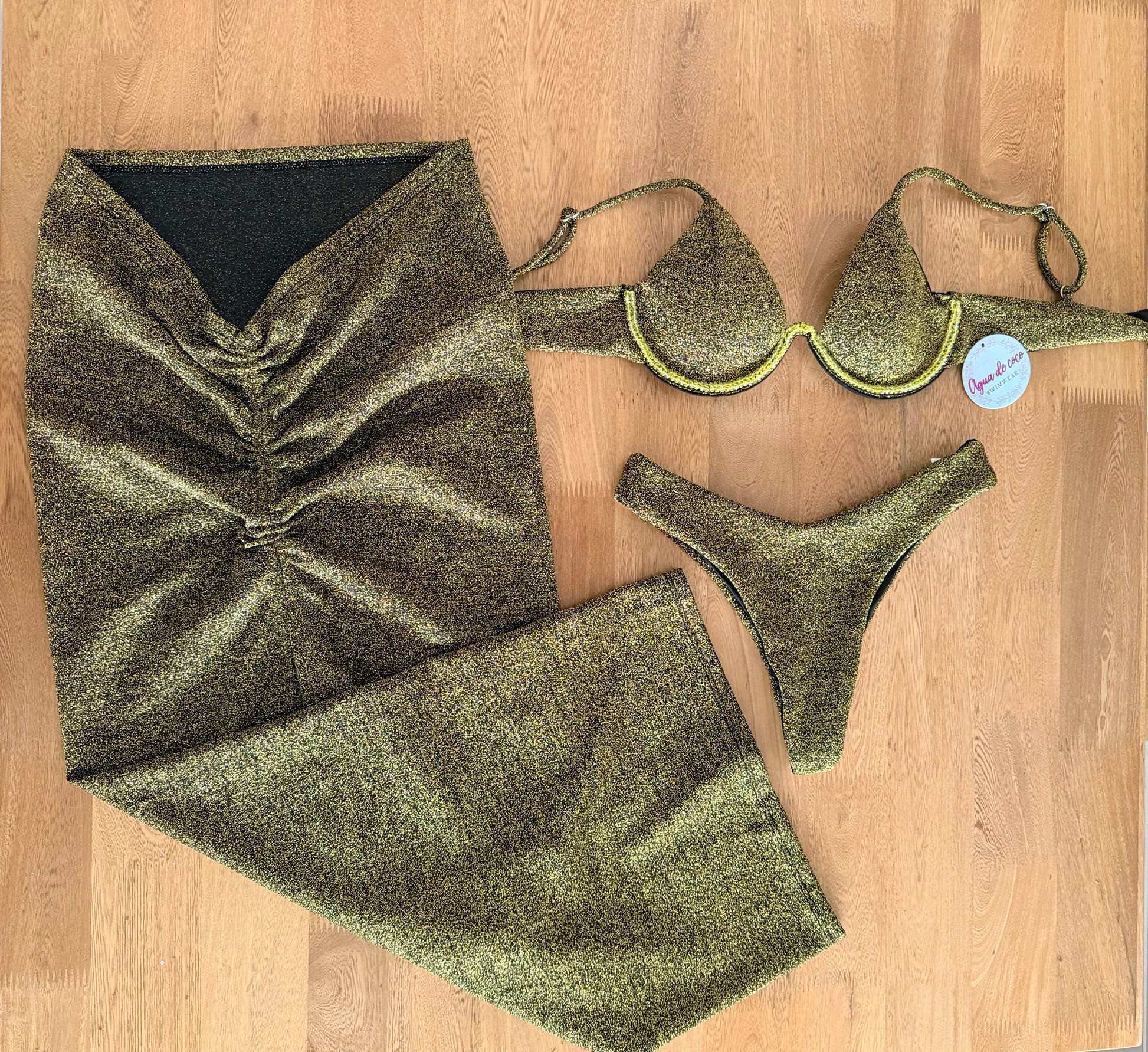 Set de bikini y falda en lycra texturizada brillante, ideal para lucir en la playa o la piscina. El bikini cuenta con top varilla continua prehormado con almohadillas y tirantes ajustables, Panty Clásico y  falda larga que le da un toque moderno y sofisticado. El acabado brillante resalta con la luz, aportando un look atrevido y llamativo.