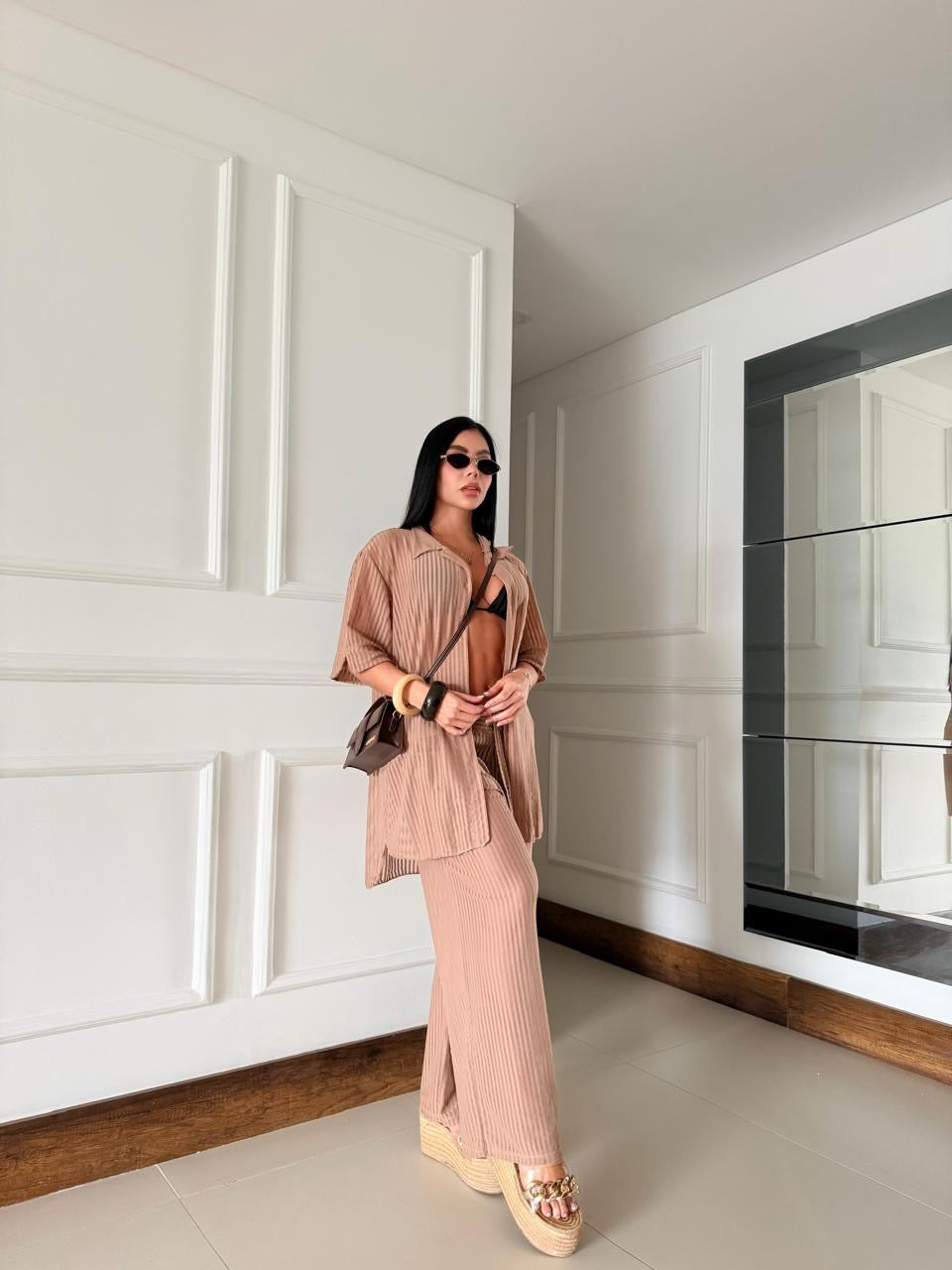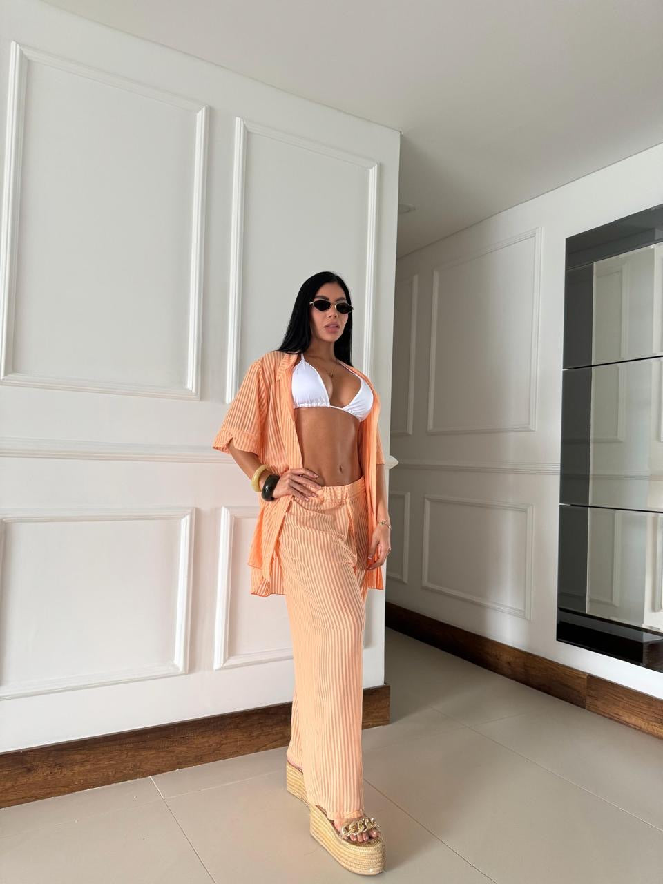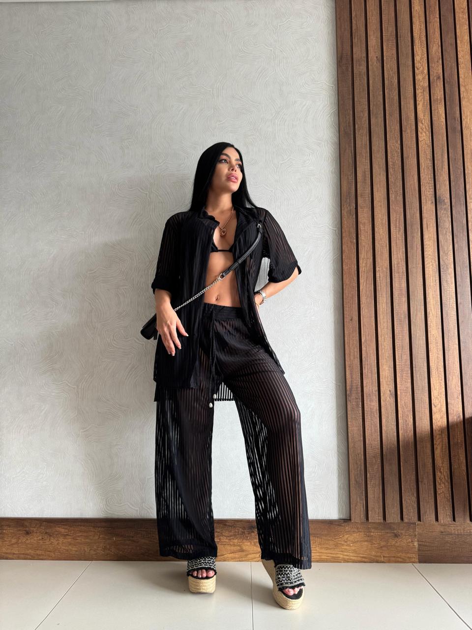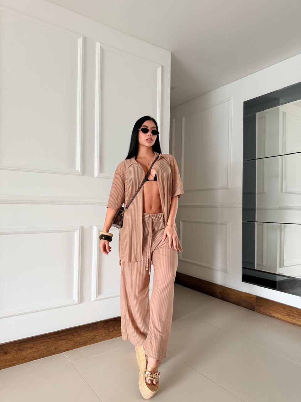 Descubre el equilibrio perfecto entre elegancia y relax con nuestro set de salida de baño compuesto por una camisera fluida y pantalones ligero, ideal para acompañarte del mar al atardecer con estilo.